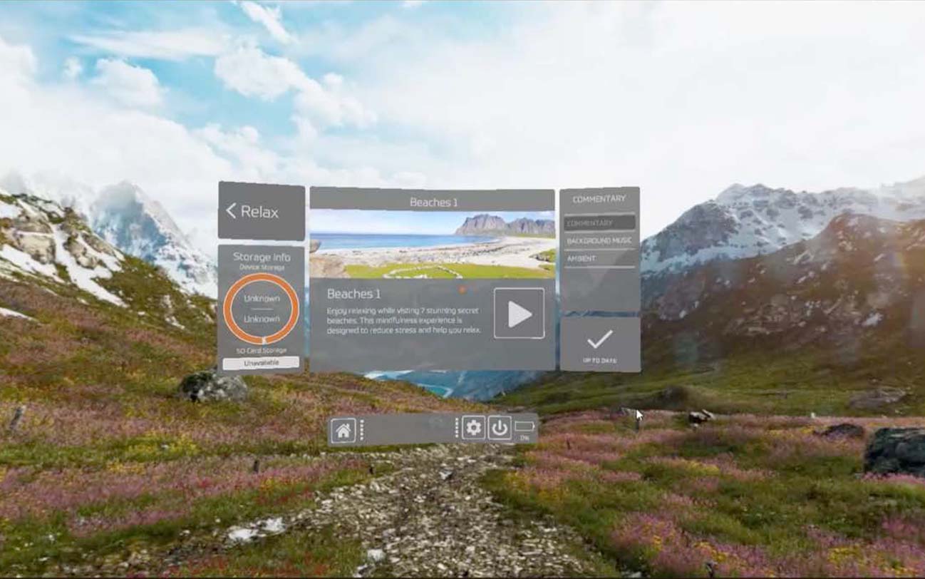 A choice of relaxation spaces set in different serene environments. Users take part in guided breathing exercises featuring relaxing imagery and calming audio. This reduces anxiety in adolescent and paediatric patients using proven breathing and sleep exercises.